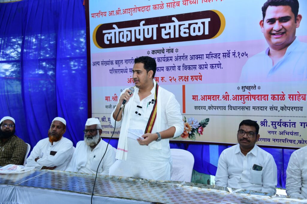 कोपरगाव शहरातील सर्व्हे नं. १०५ मधील अक्सा मस्जिदसाठी २५ लक्ष रुपये निधीतून बांधण्यात आलेल्या सभामंडपाचे लोकार्पण नुकतेच आ.आशुतोष काळे यांच्या हस्ते करण्यात आले याप्रसंगी ते बोलत होते. ते म्हणाले की, मागील साडे चार वर्षात मतदार संघाच्या विकासाचे बहुतांश अनुत्तरीत प्रश्न सोडविण्यासाठी केलेल्या अथक प्रयत्नातून तीन हजार कोटीचा निधी मिळविला असून कोपरगाव शहरातील पिण्याच्या पाण्याचा प्रश्न सोडविण्यासाठी ५ नंबर साठवण तलावासारखे असे अनेक प्रश्न मार्गी लागले आहेत.ज्याप्रमाणे कर्मवीर शंकररावजी काळे साहेब, माजी आमदार अशोकराव काळे यांनी सर्व समाजाला सोबत घेवून सर्व समाजघटकांचा विकास केला तो वारसा मी देखील पुढे चालवत आहे. त्यामुळे सर्व जाती धर्माच्या समाज मंदिराबरोबरच मुस्लीम समाजाला देखील मस्जिद, कब्रस्तानसाठी कोट्यावधी रुपयांचा निधी दिला आहे. यापुढील काळात देखील मुस्लीम समाजाच्या मागणीनुसार आवश्यक निधी देण्यासाठी प्रयत्न करू अशी ग्वाही दिली. मुस्लीम समाजाने नेहमीच काळे परिवारावर प्रेम केले असून यापुढील काळातही मुस्लीम समाजाचे प्रेम असेच अबाधित राहील असा विश्वास आ.आशुतोष काळे यांनी व्यक्त केला.यावेळी शहराध्यक्ष सुनील गंगूले,युवकचे शहराध्यक्ष नवाज कुरेशी, माजी नगरसेवक हाजी मेहमूद सय्यद यांनी देखील आपले मनोगत व्यक्त केले.