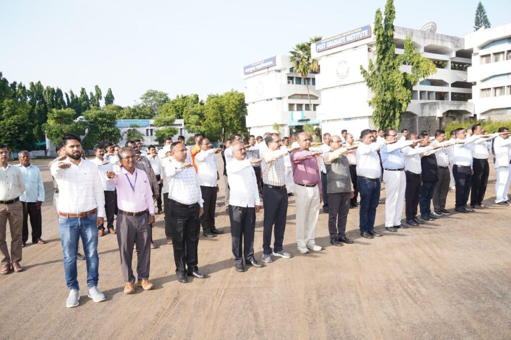 महात्मा फुले कृषि विद्यापीठातील पदव्युत्तर महाविद्यालयाच्या इमारतीसमोर कुलगुरु डॉ. पी.जी. पाटील यांच्या शुभहस्ते ध्वजवंदन करण्यात आले. यावेळी हर घर तिरंगा या अभियानांतर्गत तिरंगा प्रतिज्ञा घेण्यात आली. यावेळी कुलगुरु डॉ. पी.जी. पाटील यांनी उपस्थित सर्व अधिकारी व कर्मचार्यांना तिरंगा प्रतिज्ञा दिली. याप्रसंगी अधिष्ठाता डॉ. दिलीप पवार, संशोधन संचालक डॉ. विठ्ठल शिर्के, विस्तार शिक्षण संचालक डॉ. गोरक्ष ससाणे, कुलसचिव श्री. अरुण आनंदकर, पदव्युत्तर महाविद्यालयाचे सहयोगी अधिष्ठाता डॉ. साताप्पा खरबडे, प्रभारी नियंत्रक डॉ. बी.टी. पाटील, उपकुलसचिव प्रशासन श्री. विजय पाटील, सुरक्षा अधिकारी श्री. गोरक्ष शेटे, लेफ्ट. डॉ. सुनिल फुलसावंगे, विद्यापीठातील अधिकारी, कर्मचारी मोठ्या संख्येने उपस्थित होते.