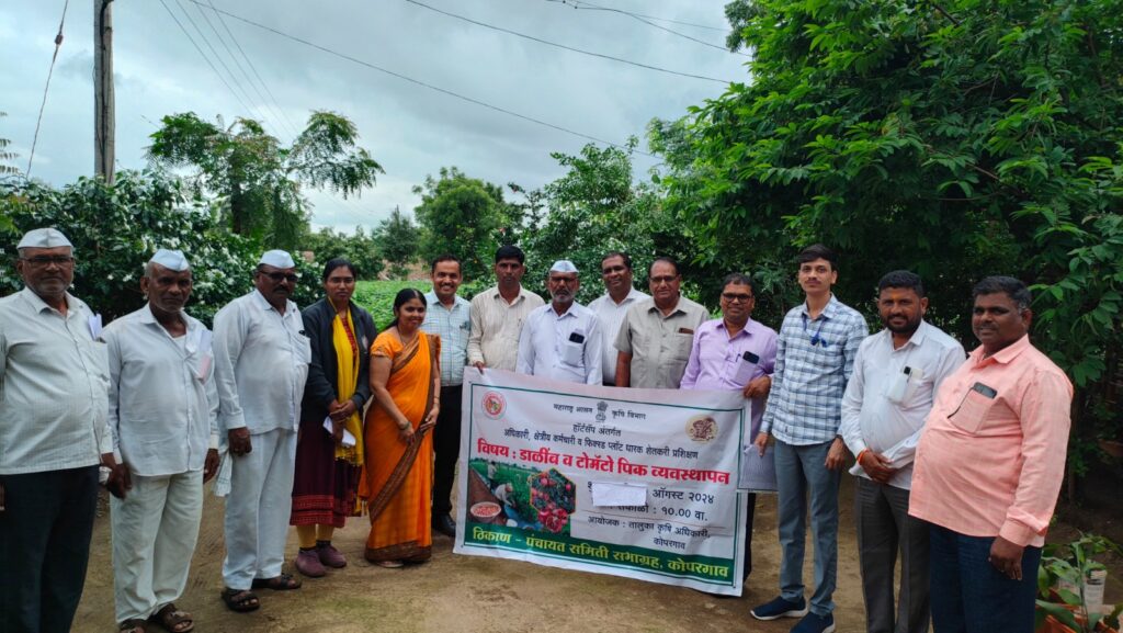 महात्मा फुले कृषि विद्यापीठ, राहुरी येथील वनस्पती रोगशास्त्र व अणुजीवशास्त्र विभाग आणि कृषि विभाग, महाराष्ट्र शासन यांचे संयुक्त विद्यमाने राबविण्यात येणार्या हॉर्टसॅप प्रकल्पामार्फत जि. अहमदनगर येथील कोपरगाव तालुक्यातील कोलपेवाडी, करवडी, माहेगांव देशमुख व काकडी या भागातील प्लॉटला विद्यापीठातील शास्त्रज्ञ व कृषि विभागातील अधिकारी यांनी भेटी दिल्या. या चमूमध्ये हॉर्टसॅप प्रकल्पाचे प्रमुख तथा वनस्पती रोगशास्त्र व कृषि अनुजीवशास्त्र विभाग प्रमुख डॉ. आण्णासाहेब नवले, अखिल भारतीय समन्वित कोरडवाहू फळपीक योजनेचे कनिष्ठ रोगशास्त्रज्ञ डॉ. प्रकाश मोरे, संशोधन सहयोगी डॉ. प्रवीण खैरे तसेच कृषि विभागातील कोळपेवाडीचे मंडळ कृषि अधिकारी श्री. पांडुरंग जाधव, पोहेगावचे मंडळ कृषि अधिकारी श्री. सुनील घारकर, काकडीचे कृषि सहाय्यक श्री. विशाल साबदे, रांजणगाव देशमुखचे कृषि सहायक श्रीमती तायडे हे उपस्थित होते. या भेटी दरम्यान शास्त्रज्ञ व अधिकार्यांनी शेतकर्यांच्या प्रत्यक्ष शेतावर जाऊन डाळींब व टोमॅटो उत्पादक शेतकरी यांच्यामध्ये सविस्तर चर्चा केली आणि चर्चेदरम्यान शेतकर्यांच्या शंकांचे निरसन करुन डाळिंब व टोमॅटो पिकावरील कीड व रोग व्यवस्थापन आणि अधिक उत्पादनासाठी सविस्तर मार्गदर्शन केले. यावेळी शेतकर्यांना डाळिंब व टोमॅटो पिकावरील रोग व कीड व्यवस्थापन याबाबत सविस्तर मार्गदर्शन करण्यात आले. पाहणी केल्यानंतर या डाळिंब बागेमध्ये जीवानुजण्य तेल्यारोग, बुरशीजन्य ठिपके या रोग व थ्रीप्स या किडीचा प्रादुर्भाव दिसला. तसेच टोमॅटो पिकामध्ये फळ पोखरणारी अळीचा प्रादुर्भाव दिसून आला. त्या अनुषंगाने किड एकात्मिक नियंत्रणासाठी विद्यापीठातील शास्त्रज्ञांनी शेतकर्यांना सखोल असे मार्गदर्शन केले. आर्थिक नुकसान पातळीच्यावर गेलेल्या गावांसाठी हॉर्टसॅप प्रकल्पांतर्गत वेळोवेळी एन.सी.आय.पी.एम., न्यु दिल्ली या संकेतस्थळावर विद्यापीठामार्फत सदर पिकासाठी पीकसरंक्षण सल्ला दिला जातो. भेटीवेळी शेतकर्यांना विद्यापीठामार्फत तयार केलेल्या अडवायसरी देण्यात आल्या. सदर प्रक्षेत्र भेटीसाठी हॉर्ट्सप प्रकल्पाचे प्रकल्प समन्वयक डॉ. संजय कोळसे यांचे सहकार्य लाभले.