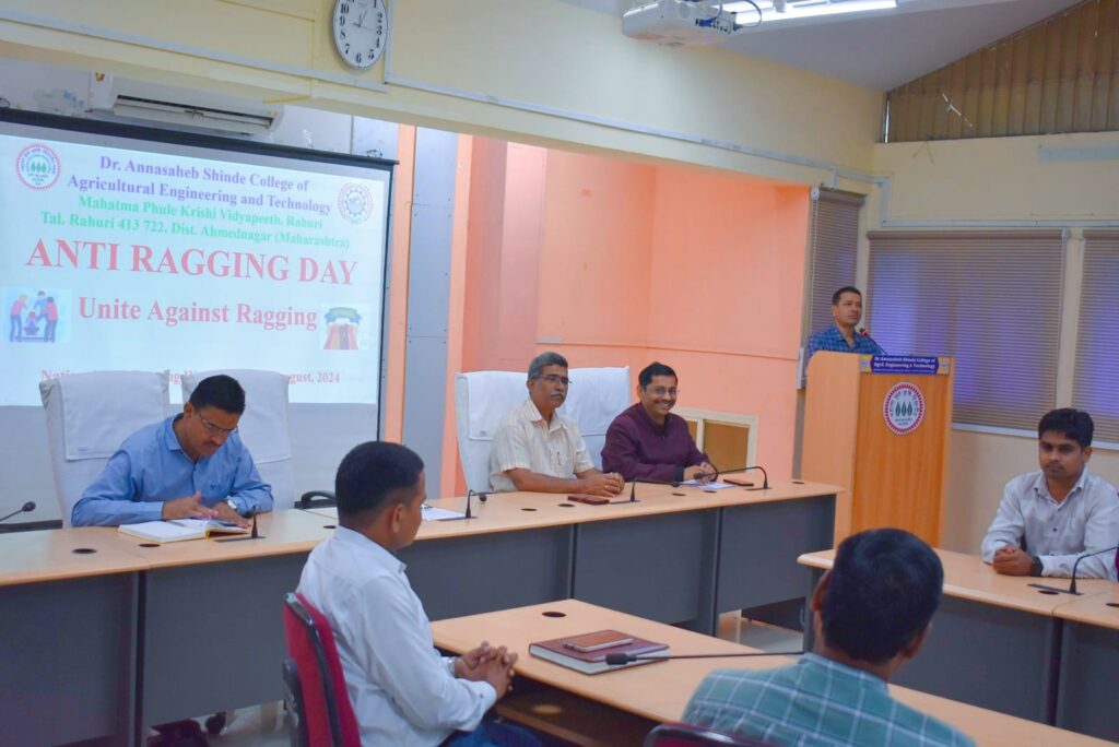 महात्मा फुले कृषि विद्यापीठातील डॉ. अण्णासाहेब शिंदे कृषि अभियांत्रिकी व तंत्रज्ञान महाविद्यालयात अँटी रॅगींग डे साजरा करण्यात आला. यावेळी कार्यक्रमाच्या अध्यक्षस्थानावरुन अधिष्ठाता डॉ. दिलीप पवार बोलत होते. याप्रसंगी कुलमंत्री तथा प्राध्यापक डॉ. विक्रम कड, कृषि प्रक्रिया अभियांत्रिकी विभाग प्रमुख डॉ. कैलास कांबळे, प्राध्यापक डॉ. ममता पटवर्धन, तांत्रिक अधिकारी डॉ. सुनील फुलसावंगे, सहाय्यक कुलसचिव श्री. वैभव बारटक्के उपस्थित होते.
