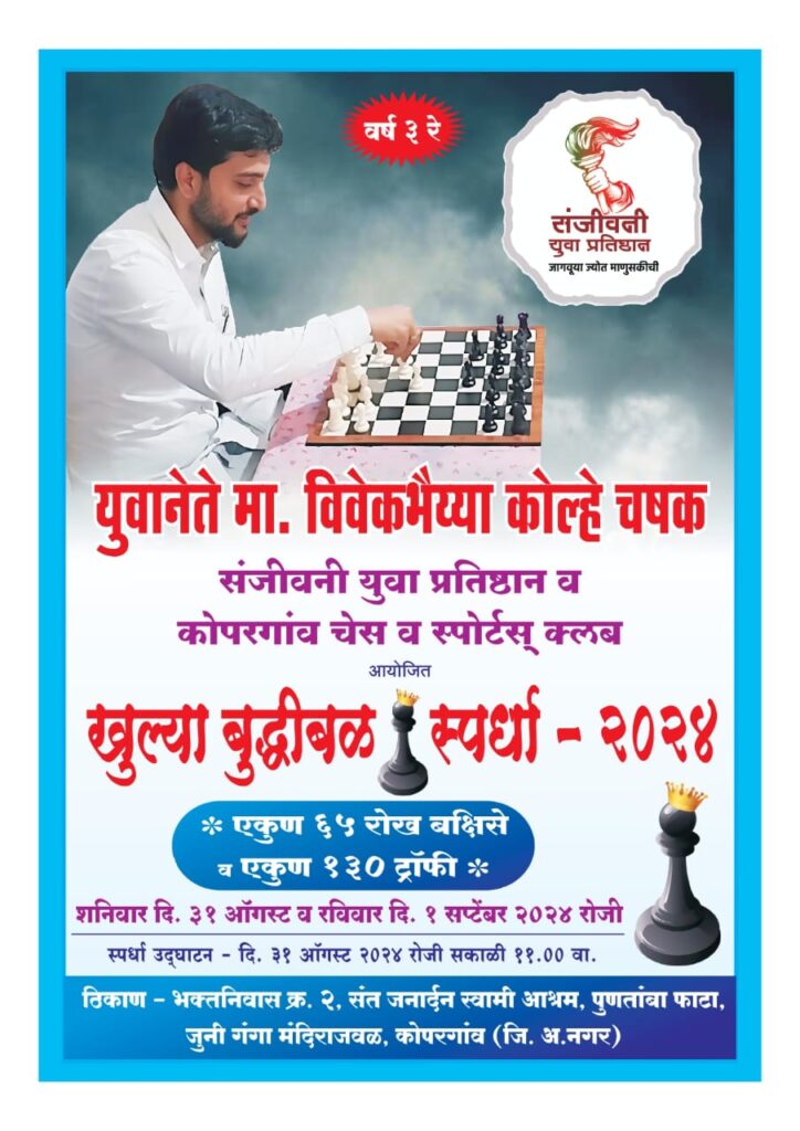 कोपरगाव प्रतिनिधी:- कोपरगाव शहर आणि परिसरातील बुद्धिबळ खेळाडूंना प्रोत्साहन देण्यासाठी सलग तिसऱ्या वर्षी संजीवनी युवा प्रतिष्ठान आणि कोपरगाव चेस व स्पोर्ट्स क्लबच्या वतीने ३१ऑगस्ट आणि १ सप्टेंबर रोजी विवेकभैय्या कोल्हे चषक खुल्या बुद्धिबळ स्पर्धेचे आयोजन करण्यात आले आहे.या स्पर्धेसाठी देशातील विविध राज्यातून स्पर्धेत सहभागी होणार असल्याची माहिती आयोजकांच्या वतीने देण्यात आली आहे.