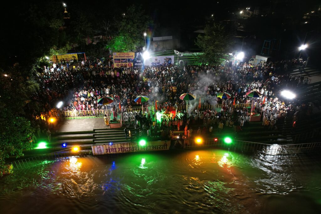 आपल्या कोपरगाव आणि परिसराला गोदावरी समृध्द करते आहे.शेतकरी आणि नागरिकांची तहान भागवण्याचे काम गोदामाता करते.अध्यात्मिक आणि धार्मिक परंपरा जतन होणे आवश्यक आहे.विवेकभैय्या आणि त्यांचे युवा सहकारी अतिशय चांगले काम करत आहे.आमचे कोल्हे कुटुंबाचे नेहमी काम समाज सेवेचा विचार पुढे घेऊन जाण्याचे आहे.सामाजिक जाणीव जपणारे उपक्रम राबवणारे युवक ही खरी ऊर्जा आहे असे सौ.स्नेहलताताई कोल्हे म्हणाल्या.तसेच त्यांनी चारही सोमवार बोटीची मदत देत पाण्यातून फटाक्यांची आतिषबाजी करणारे मा.नगरसेवक अनिल(कालूआप्पा) आव्हाड,किरण आव्हाड,सागर पंडोरे,प्रवीण पंडोरे,किरण सिनगर,सोमनाथ आहेर,शुभम आव्हाड यांचे कौतुक केले व पोलीस प्रशासन आणि पत्रकार यांचे आभार मानले.