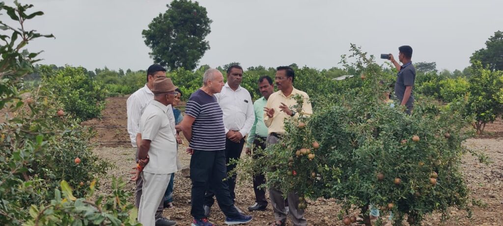 महात्मा फुले कृषि विद्यापीठ, राहुरी येथील डाळिंब गुणवत्ता केंद्राच्या प्रात्यक्षिक प्रक्षेत्रावरील हवामानावर आधारित ठिबक सिंचन पद्धतीचे डाळिंब उत्पादक शेतकर्यांनी अनुकरण करून डाळिंब बागेत पाण्याचे काटेकोर नियोजन करावे असे आवाहन माशाव एम्बसी ऑफ इस्त्राईल येथील ऍग्रीकल्चर अटॅचीचे डाळिंब शेतीतील पाणी व्यवस्थापन तज्ञ श्री. उरी रुबीनस्टन यांनी केले. महात्मा फुले कृषि विद्यापीठ, राहुरी येथील डाळिंब गुणवत्ता केंद्रास त्यांनी भेट दिली, त्यावेळी ते बोलत होते. यावेळी उद्यानविद्या विभाग प्रमुख डॉ. बी.टी. पाटील, पुणे येथील महाराष्ट्र राज्य फलोत्पादन व औषधी वनस्पती मंडळाच्या प्रकल्प व्यवस्थापक सौ. पल्लवी देवरे, श्रीरामपूरचे उपविभागीय कृषि अधिकारी श्री. अमोल काळे, उद्यानविद्यावेता डॉ. सुभाष गायकवाड, कीटकशास्त्रज्ञ डॉ. अशोक वाळुंज व वनस्पती रोग शास्त्रज्ञ डॉ. प्रकाश मोरे यावेळी उपस्थित होते. सदर भेटीदरम्यान श्री. उरी रुबीनस्टन यांनी राहुरी तालुक्यातील वरवंडी गावातील डाळिंब बागांची पाहणी करून उपस्थित शेतकर्यांना मार्गदर्शन केले. यावेळी कृषि विद्यापीठाचे संपर्क शेतकरी श्री. बाळासाहेब कोंडीराम अडसुरे यांची डाळिंब बाग पाहून त्यांनी समाधान व्यक्त केले. श्री. अडसुरे यांच्याप्रमाणेच इतर सर्व शेतकर्यांनी कृषि विद्यापीठाचे प्रसारित तंत्रज्ञान आत्मसात करून डाळिंब शेती करणे गरजेचे असल्याचे त्यांनी सांगितले. या भेटीच्या वेळी राहुरी कृषि विभागाचे कृषि सहाय्यक श्री. चंद्रकांत म्हसे, अ.भा.स. कोरडवाहू फळे संशोधन प्रकल्पाचे कृषि सहाय्यक श्री. दत्तात्रय गायकवाड, श्री. महेश ढगे, श्री. राहुल अडसुरे, श्री. विजय अडसुरे, श्री. सतीश अडसुरे, श्री. दिलीप अडसुरे, श्री. सुनील अडसुरे, श्री. कमलभाई शेख आदी शेतकरी उपस्थित होते.