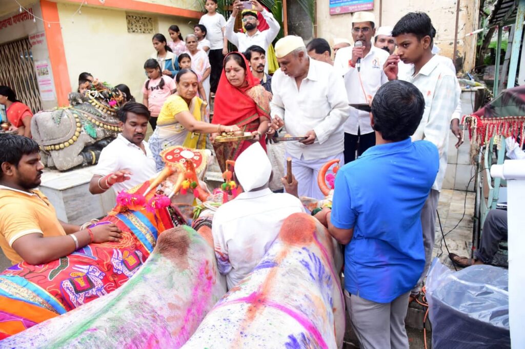 प्रारंभी कोपरगांव शहर पोलीस स्टेशनचे सहाय्यक पोलीस निरीक्षक आशिष शेळके,कोपरगांव नगरपरिषदेचे उप मुख्याधिकारी मनोजकुमार पापडीवाल,सोमेश्वर महादेव देवस्थानचे प्रमुख महेंद्र पाटील,सौ.संगिताताई पाटील, मुख्य कार्यकारी अधिकारी सुशांत घोडके,गोसेवक धनंजय जोशी यांचे उपस्थिती सोमेश्वर महादेव देवस्थान येथे परंपरागत पध्दतीने अभिषेक पुजा आणि आरती संपन्न झाली.त्या नंतर वेशीचे पुजन करण्यात येवून पोळा फोडण्यात आला.वेशी जवळील ग्रामदैवत हनुमानाचे दर्शन घेवून शेतकरी बैलजोडी सह सोमेश्वर महादेव देवस्थान येथे आले.तेथे श्रीमंत पवार सरकार संस्थानचे सोमेश्वर महादेव देवस्थानचे वतीने बैलजोडी पुजन करण्यात आले.या प्रसंगी कोपरगांव शहर पोलीस स्टेशनचे सहाय्यक पोलीस निरीक्षक आशिष शेळके,कोपरगांव नगरपरिषदेचे उप मुख्याधिकारी मनोजकुमार पापडीवाल,सोमेश्वर महादेव देवस्थानचे प्रमुख महेंद्र पाटील,सौ.संगिताताई पाटील,मुख्य कार्यकारी अधिकारी सुशांत घोडके,गोसेवक धनंजय जोशी व्यवस्थापन समितीचे सदस्य जयंत विसपुते, महावीर शिंगी,पौरोहित्य संजय रोडे,नंदू शेंडे गुरव,रमेश जंगम,निवृत्ती वाघमारे,दत्ता काले,संतोष साबळे, सुनिल फंड,निलेश उदावंत,मनोज कपोते,सुधाकर जाधव,प्रदिप मते,कुणाल लोणारी,गौरिष लहुरीकर, राहुल देवळालीकर,संतोष चवंडके,कैलास आढाव, मनोज नरोडे,विकी जोशी,सर्वज्ञ जोशी,राहुल आदमाने,ज्ञानेश्वर चाकणे, प्रेमकुमार गायकवाड, संजय तिरसे, स्वप्निल जाधव,आरोग्य निरीक्षक सुनील आरणे,विभाग प्रमुख मनोज लोट, निलेश,बुचकुले, यांचे सह कोपरगाव नगरपरिषदे अधिकारी व कर्मचारी, सोमेश्वर महादेव देवस्थानचे भक्त,ग्रामस्थ उपस्थित होते.