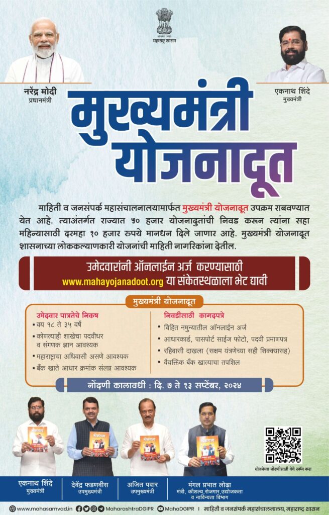 महाराष्ट्र शासनाच्या माहिती व जनसंपर्क महासंचालनालयामार्फत मुख्यमंत्री योजनादूत उपक्रम राबविण्यात येत आहे. प्रत्येक ग्रामपंचायत पातळीवर एक तर शहरी भागात प्रत्येक पाच हजार लोकसंख्येमागे एक अशा पद्धतीने राज्यात एकूण ५० हजार योजनादूतांची सहा महिन्यांसाठी निवड केली जाणार आहे. या योजनादूतांना दरमहा १० हजार रूपये मानधन दिले जाणार आहे. हे योजनादूत शासनाच्या लोककल्याणकारी योजनांबाबत नागरिकांना माहिती देतील.