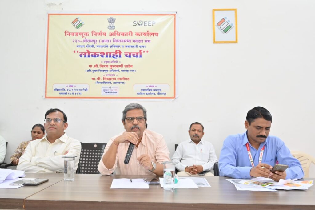 श्रीरामपूर उपविभागीय अधिकारी तथा निवडणूक निर्णय अधिकारी कार्यालयाच्यावतीने आयोजित ‘लोकशाही चर्चा’ या चर्चासत्रात ते बोलत होते. कार्यक्रमाला जिल्हाधिकारी सिद्धाराम सालीमठ, उपविभागीय अधिकारी किरण सावंत, तहसीलदार मिलिंदकुमार वाघ आदी उपस्थित होते.