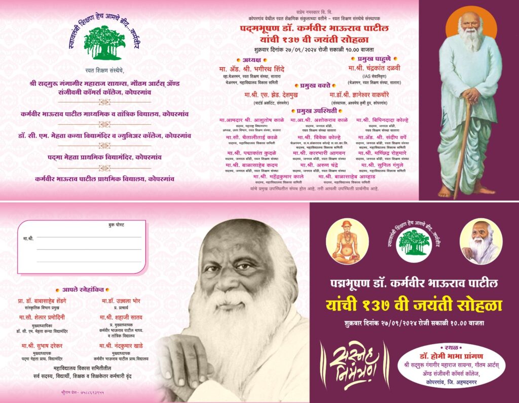 बहुजनांना शिक्षणाची दारे खुली करून त्यांना समाजाच्या मुख्य प्रवाहात आणण्याचे महान कार्य पद्मभूषण डॉक्टर कर्मवीर भाऊराव पाटील यांनी केले आहे. त्यांच्या कार्याचे स्मरण ठेवण्यासाठी आज महाराष्ट्रभर कर्मवीर जयंती साजरी केली जाते आहे. सदर कार्यक्रम शुक्रवार दिनांक २७ सप्टेंबर २०२४ रोजी साजरा होत आहे. हा समारंभ श्री सद्गुरु गंगागीर महाराज सायन्स, गौतम आर्ट्स अँड संजीवनी कॉमर्स कॉलेज कोपरगाव, कर्मवीर भाऊराव पाटील माध्यमिक व तांत्रिक विद्यालय कोपरगाव, डॉ. सी.एम.मेहता कन्या विद्या मंदिर व ज्युनिअर कॉलेज कोपरगाव, पद्मा मेहता प्राथमिक विद्यामंदिर कोपरगाव, कर्मवीर भाऊराव पाटील प्राथमिक विद्यालय कोपरगाव, यांच्या संयुक्त विद्यमाने होत आहे.