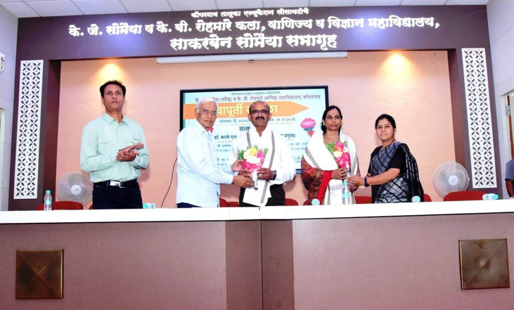 “आमच्या सोमैया महाविद्यालयामध्ये गेल्या 50-60 वर्षांमध्ये प्रा.ना.स.फरांदे, डॉ. गुळगुळे, प्रा. घैसास आदी अनेक विद्वान आणि नामवंत प्राध्यापक होऊन गेलेत, ज्यांच्यामुळे महाविद्यालयाचा नावलौकिक झाला. विज्ञान शाखेचे रसायनशास्त्र विभाग प्रमुख डॉ. सतीश काळे याच परंपरेतील एक अभ्यासू आणि कष्टाळू प्राध्यापक होत. त्यांच्या रूपाने विज्ञान शाखेचा पहिला प्राध्यापक आज निवृत्त होत आहे. आज नावारूपास आलेली विज्ञान शाखा उभी करण्यात काळे सरांचे योगदान मोठे आहे”, असे प्रतिपादन को. ता. एज्यु. सोसायटीचे अध्यक्ष मा. अशोकराव रोहमारे यांनी येथे केले. स्थानिक के. जे. सोमैया महाविद्यालयाचे रसायनशास्त्र विभाग प्रमुख डॉ. सतीश काळे यांच्या सेवापूर्ती समारंभाचे अध्यक्ष म्हणून ते बोलत होते.