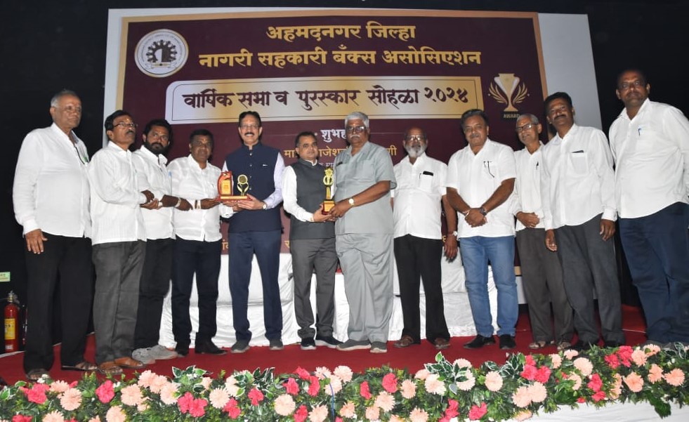 फोटो ओळ- नागरी सहकारी बँक असोसिएशनच्या वतीने अध्यक्ष सत्यन मुदंडा,उपाध्यक्ष शिवाजी व्यवहारे, प्रतिष्ठीत उद्योजक राजेश मालपाणी यांच्या हस्ते पुरस्कार स्विकारतांना बँकेचे व्हा. चेअरमन बापूसाहेब जावळे, प्रशासकीय अधिकारी बापूसाहेब घेमूड, व्यवस्थापन मंडळाचे अध्यक्ष श्रीकांत तिरसे व संचालक मंडळ