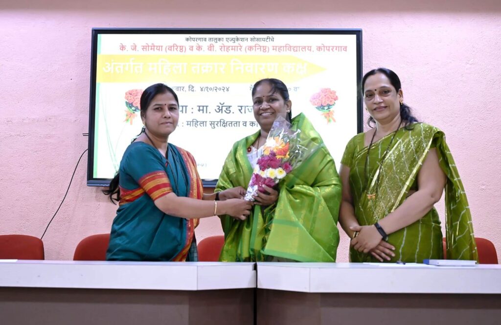 ” विशाखा गाईडलाईन नुसार अंतर्गत महिला तक्रार निवारण समिती स्थापन झाली. त्यानंतर दिल्लीमध्ये घडलेले निर्भया किंवा अगदी अलीकडचे कोलकात्यामधील अपराजिता प्रकरण असेल या संदर्भात केंद्र शासन आणि संबंधित राज्य शासन खडबडून जागे झाले आणि महिला सुरक्षेच्या दृष्टीने अत्यंत कडक कायदे करण्यात आले.” असे प्रतिपादन अॅड. राजश्री शिंदे यांनी येथे केले. स्थानिक के. जे. सोमैया महाविद्यालयाच्या अंतर्गत महिला तक्रार निवारण कक्षाच्या वतीने ‘महिला सुरक्षितता व कायद्याचे ज्ञान’ या विषयावर आयोजित विशेष व्याख्यान सत्रात त्या बोलत होत्या. कार्यक्रमाच्या अध्यक्षस्थानी महाविद्यालयाचे प्रभारी प्राचार्य डॉ. विजय ठाणगे होते.