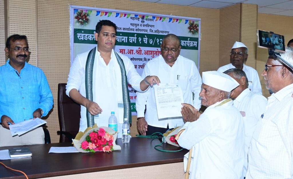 कोपरगाव तहसील कार्यालयाच्या सभागृहात आ. आशुतोष काळे यांच्या हस्ते खंडकरी शेतकऱ्यांना वर्ग १ च्या सात बारा उताऱ्यांचे वितरण करण्यात आले याप्रसंगी ते बोलत होते. यावेळी महानंदाचे माजी चेअरमन राजेश परजणे, तहसीलदार महेश सावंत, कर्मवीर शंकरराव काळे कारखाना तसेच विविध संस्थांचे संचालक, पदाधिकारी,महसूल विभागाचे अधिकारी, खंडकरी शेतकरी मोठ्या संख्येने उपस्थित होते.