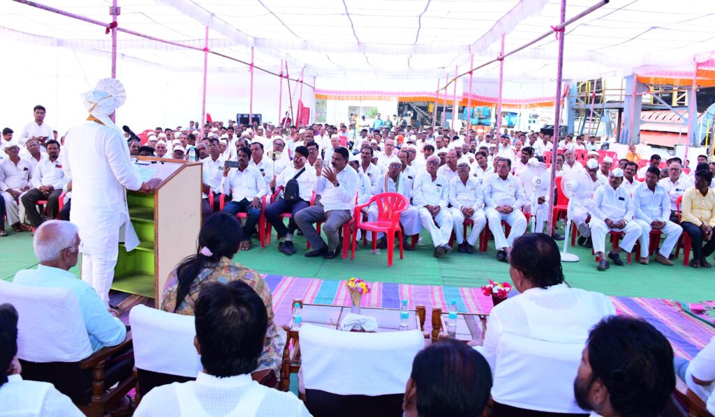 फोटो ओळ -२) कर्मवीर शंकरराव काळे सहकारी साखर कारखान्याच्या ७० व्या गळीत हंगाम शुभारंभ प्रसंगी मार्गदर्शन करतांना कारखान्याचे चेअरमन आ. आशुतोष काळे व उपस्थित ऊस उत्पादक शेतकरी.