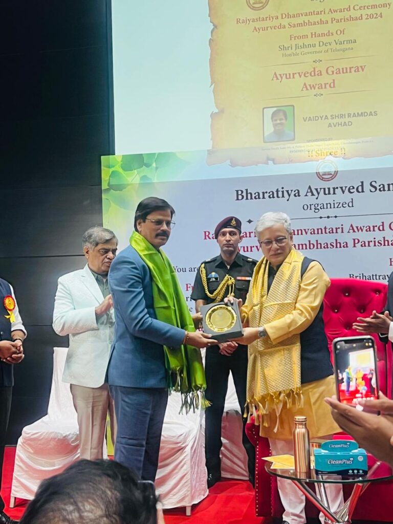 पुणे येथील भारतीय आयुर्वेद संस्थेद्वारा आयोजित “आयुर्वेद संभाषा परिषद २०२४” या राष्ट्रीय परिषदेत पुणे येथील सुमंत मुळगावकर सभागृहात तेलंगना राज्याचे राज्यपाल मा.श्री. जिष्णु देव वर्मा यांच्या शुभहस्ते तसेच वैद्य सदानंद सरदेशमुख, वैद्य समीर जमदग्नी यांच्यासह इतर मान्यवरांच्या उपस्थितीत डॉ. रामदास आव्हाड यांना “आयुर्वेद गौरव पुरस्कार” प्रदान करण्यात आला.