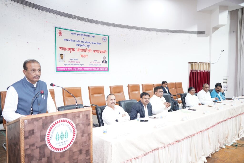 महात्मा फुले कृषि विद्यापीठ, राहुरी आणि राजयोग शिक्षण आणि शोध प्रतिष्ठान, शिक्षण प्रभाग, ब्रम्हाकुमारीज, राहुरी यांच्या संयुक्त विद्यमाने तणावमुक्त जीवनशैली जगण्याची कला या विषयावर डॉ. नानासाहेब पवार सभागृहात व्याख्यानाचे आयोजन करण्यात आले होते. या कार्यक्रमाच्या अध्यक्षस्थानावरुन कुलगुरु डॉ. पी.जी. पाटील बोलत होते. यावेळी प्रमुख वक्ते म्हणुन नाशिक येथील प्रजापिता ब्रम्हाकुमारी ईश्वरीय विश्वविद्यालयाचे समुपदेशक आणि मनोविकार सल्लागार प्रा. विकास साळुंखे उपस्थित होते. याप्रसंगी संचालक संशोधन डॉ. विठ्ठल शिर्के, अधिष्ठाता डॉ. साताप्पा खरबडे, विस्तार शिक्षण संचालक डॉ. गोरक्ष ससाणे, नियंत्रक श्री. सदाशिव पाटील, विद्यापीठ अभियंता श्री. मिलिंद ढोके व राहुरी येथील प्रजापिता ब्रम्हाकुमारी ईश्वरीय विद्याविद्यालयाच्या संचालीका बीके. नंदा दिदी उपस्थित होत्या.