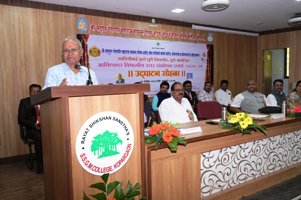 कोपरगाव प्रतिनिधी- रयत शिक्षण संस्थेच्या श्री सद्गुरु गंगागीर महाराज सायन्स, गौतम आर्ट्स अँड संजीवनी कॉमर्स कॉलेज, कोपरगाव येथे ‘अविष्कार’ विभागीय संशोधन स्पर्धेचे आयोजन केले होते. या स्पर्धेच्या उद्घाटनाच्या अध्यक्षस्थानी रयत शिक्षण संस्थेचे व्हा. चेअरमन आणि महाविद्यालय विकास समितीचे चेअरमन अँड. भगीरथ शिंदे हे होते. ते आपल्या अध्यक्षीय मनोगतात म्हणाले, “संशोधनामुळे ज्ञानाचे प्रदर्शन होते व कल्पना तथ्यांसह जागृत होतात. या स्पर्धेत विद्यार्थी संशोधक नाविन्यपूर्ण संशोधन प्रकल्प सादर करणार आहेत. हेच संशोधन समाज आणि विद्वानांना विचार करण्यास आणि विविध समस्यावर उपाय शोधण्यासाठी सक्षम बनवते. या स्पर्धेमुळे ग्रामीण आणि शहरी विद्यार्थ्यांना आपले संशोधन विचार मांडण्याची ही सुवर्णसंधी आहे”. सावित्रीबाई फुले पुणे विद्यापीठात २००६ पासून महाविद्यालयीन विद्यार्थ्यांच्या संशोधन वृत्तीला चालना देण्यासाठी अविष्कार, अन्वेषण इ. संशोधन विषयक स्पर्धांचे आयोजन केले जाते.