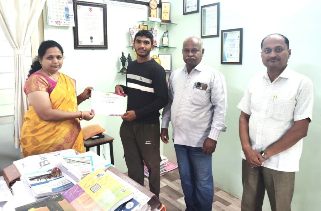 फोटो ओळ-बळवंत ढोमसे याचे अभिनंदन करतांना प्राचार्या डॉ.विजया गुरसळ समवेत प्रशिक्षक प्रा.डॉ.राजेंद्र चव्हाण, प्रा.किशोर पवार.