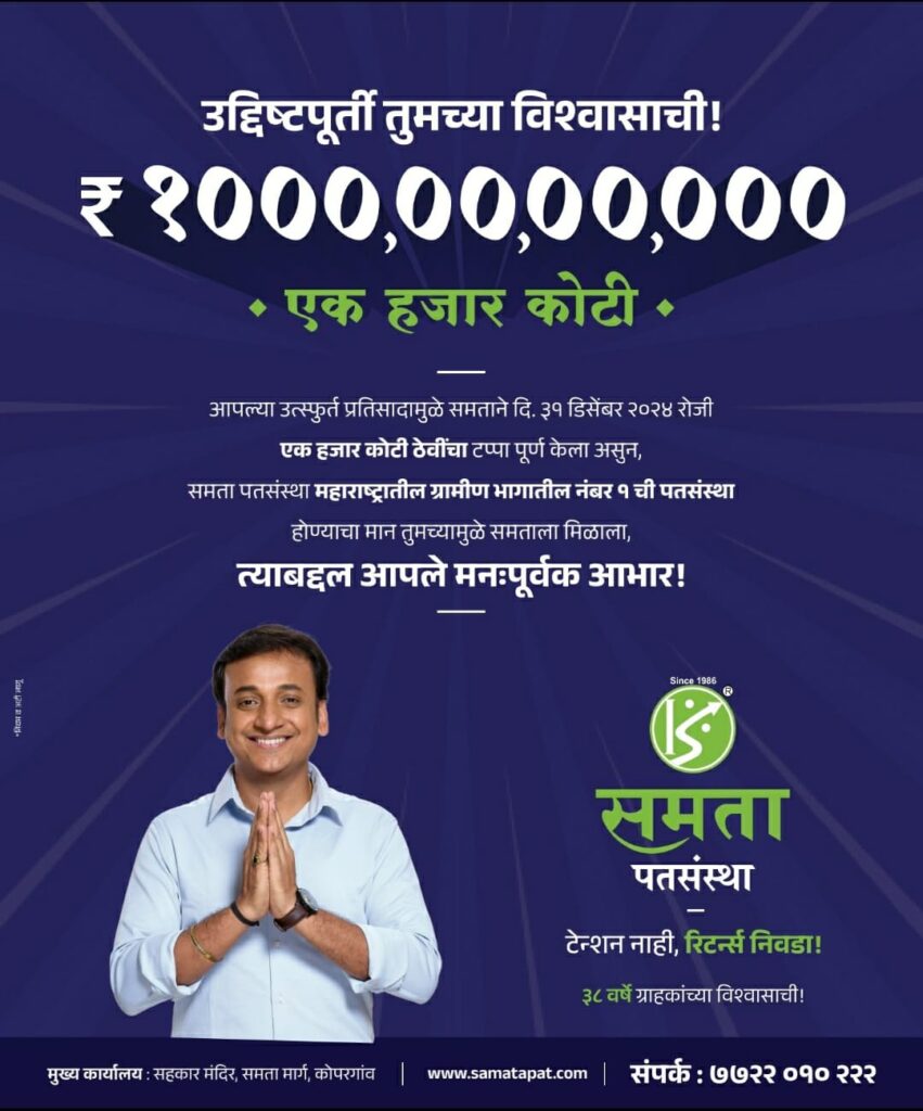 चौकट – ३१ मार्च २०२५ पर्यंत आम्ही १ हजार कोटी रुपयांच्या ठेवींचा टप्पा पार करण्याचे उद्दिष्ट ठेवले होते. परंतु समता पतसंस्थेचे पदाधिकारी, अधिकारी, कर्मचारी यांच्या सहाय्याने व ग्राहकांनी दाखविलेल्या विश्वासामुळे ३१ डिसेंबर २०२४ लाच १ हजार कोटी रुपयांच्या ठेवींचा टप्पा पार केला असून १ हजार ९ कोटी रुपयांपर्यंत मजल मारली आहे.