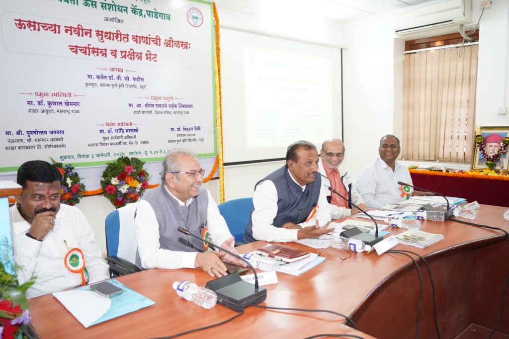 महात्मा फुले कृषि विद्यापीठ, राहुरी अंतर्गत असलेल्या मध्यवर्ती ऊस संशोधन केंद्र, पाडेगाव येथे नव्याने प्रसारीत झालेल्या ऊसाच्या सुधारीत वाणांची तांत्रिक माहिती होण्याकरीता ऊसाच्या सुधारीत वाणांची ओळख या विषयावर एक दिवसीय चर्चासत्र व प्रक्षेत्र भेट कार्यक्रमाचे आयोजन मध्यवर्ती ऊस संशोधन केंद्र, पाडेगाव येथे करण्यात आले होते. यावेळी झालेल्या चर्चासत्राच्या कार्यक्रमात अध्यक्षीय स्थानावरून कुलगुरू डॉ. पी.जी. पाटील बोलत होते. यावेळी व्यासपीठावर प्रमुख अतिथी म्हणून सातारा जिल्हा मध्यवर्ती सहकारी बँकेचे मुख्य कार्यकारी अधिकारी डॉ. राजेंद्र सरकाळे, पुणे येथील वेस्ट इंडियन शुगर मिल्स असोसिएशनचे कार्यकारी संचालक श्री. अजित चौगुले, संशोधन संचालक डॉ. विठ्ठल शिर्के, अजिंक्यतारा सहकारी साखर कारखान्याचे कार्यकारी संचालक श्री. जीवाजीराव मोहिते, विद्यापीठाचे कुलसचिव डॉ. नितीन दानवले, पाडेगाव ऊस संशोधन केंद्राचे ऊस विशेषज्ञ डॉ. राजेंद्र भिलारे आणि पाडेगावचे सरपंच श्री. राहुल कोकरे उपस्थित होते.