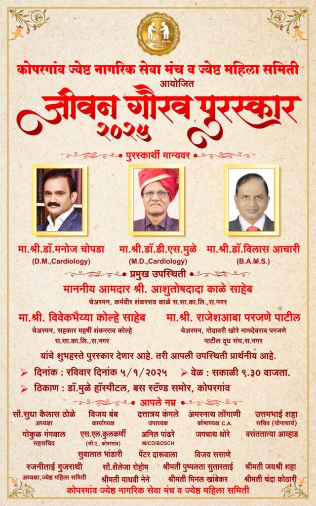 अशा या महान विभूती ना कोपरगावकरांच्या वतीने जीवनगौरव पुरस्कार दिला जात आहे. हे नाशिक व अहमदनगर भागात लोकांची मानाची व आनंदाची गोष्ट आहे !