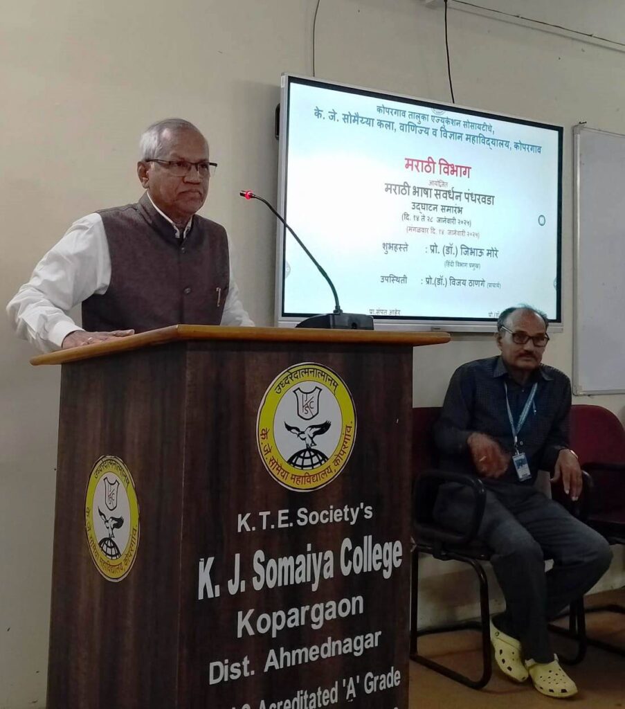“मराठी आपली मातृभाषा असून देखील आपल्याला मराठी बोलतांना अनेक अडचणी येतात. याचे कारण मराठी विषयी आपली उदासीनता हे होय. आपण आपल्या मातृभाषेपासून दिवसेंदिवस दूर जात आहोत. शासकीय मराठी माध्यमांच्या शाळा बंद पडत आहेत व खाजगी इंग्रजी माध्यामांच्या शाळांचा सुकाळ आहे. कोणतीही भाषा शिकतांना वाचन, लेखन व श्रवण कौशल्य आत्मसात करणे गरजेचे आहे, भाषेचे वैभव कायम राखण्यासाठी ही कौशल्ये शिकणे क्रमप्राप्त आहे. उत्तम वक्ता होण्यासाठी उत्तम श्रोता बनावे लागेल” असे प्रतिपादन हिंदी व मराठी विषयाचे अभ्यासक, अनुवादक प्रो.(डॉ.) जिभाऊ मोरे यांनी केले आहे. के. जे. सोमैया कला, वाणिज्य व विज्ञान महाविद्यालयात “मराठी भाषा संवर्धन पंधरवडा” समारंभाचे उद्घाटक म्हणून ते बोलत होते. कार्यक्रमाच्या अध्यक्षस्थानी महाविद्यालयाचे प्राचार्य मा.प्रो.(डॉ.) विजय ठाणगे हे होते.