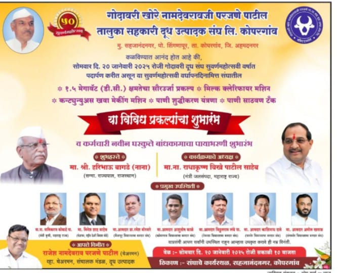 १९७६ साली स्थापन झालेल्या गोदावरी दूध संघाने नियमित शेतकरी दूध उत्पादक यांच्या प्रगतीचा विचार करत दिवसागणिक आपली प्रगतीची वाटचाल सुरू ठेवली आहे. आज संघाच्या ५० व्या म्हणजेच सुवर्ण महोत्सवी वर्षात पदार्पण होत असताना संघाच्या माध्यमातून वीज बचतीचे एक पाऊल पुढे टाकत १.५ मेगावॅट (डी.सी) क्षमतेचा सौर ऊर्जा प्रकल्पाची निर्मिती केली आहे, ग्राहकांना परिपूर्ण शुद्ध दूध मिळावे या करिता मिल्क क्लिरिफायर मशीन कार्यान्वित केले आहे. ग्राहकांना उच्च प्रतीचा एक सारखा खवा मिळावा म्हणून अत्याधुनिक असे कंटिन्यूअस खवा मेकिंग मशीन, नव्याने निर्मिती केलेल्या पाणी शुद्धीकरण यंत्रणेचा तसेच पाणी साठवण टॅंकचा शुभारंभ होणार आहे. तर नेहमीच संघाच्या कामगारांचे हीत जोपासत असणाऱ्या संघाच्या संचालक मंडळाने आपल्या कर्मचारी व अधिकाऱ्यांकरीता संघाच्या कार्यस्थळावर नवीन घरकुल बांधण्याचा महत्वकांशी निर्णय घेतला असून या घरकुल बांधकामाचा पायाभरणी शुभारंभ देखील या प्रसंगी मान्यवरांच्या शुभहस्ते होणार आहे.तरी आपण सर्वांनी या सुवर्णक्षणाचे साक्षीदार होण्यासाठी उपस्थित राहावे असे आवाहन नामदेवरावजी परजणे पाटील तालुका सहकारी दूध उत्पादक संघाचे चेअरमन राजेशआबा परजणे, व्हाईस चेअरमन, सर्व संचालक मंडळ अधिकारी कर्मचारी यांनी केले आहे