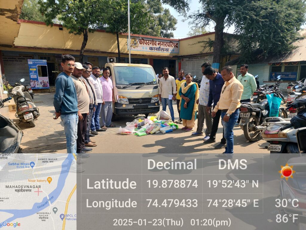 केंद्रीय प्रदूषण नियंत्रण मंडळाच्या सुचनेनुसार सिंगल युज प्लास्टिक बंदीच्या अनुषंगाने विशेष अभियान घेण्याबाबत राज्यातील सर्व नगरपरिषदांना कळविण्यात आलेले होते. त्यानुसार कोपरगाव नगरपरिषदेने दि. २३ जानेवारी रोजी शहरातील धारणगाव रोडवर व तसेच इतर भागात असणारे फळ विक्रेते, चिकन मांस विक्रेते, स्वीट मार्टस तसेच हॉटेल्स इ. वर कार्यवाही करून त्यांच्याकडून जवळपास अंदाजे ३०-३५ किलो प्लास्टिक जप्त करण्यात आले आहे.