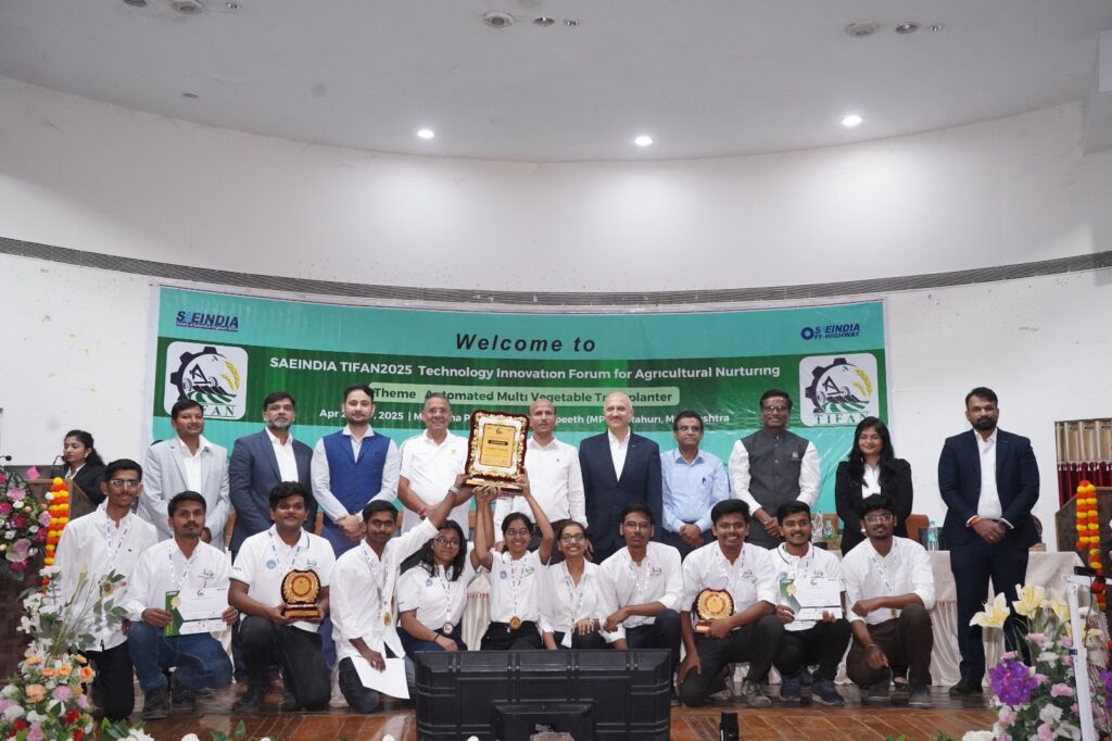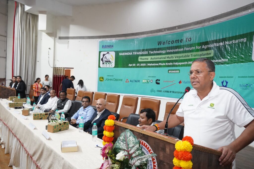 महात्मा फुले कृषी विद्यापीठामध्ये महात्मा फुले कृषी विद्यापीठ, राहुरी व सोसायटी ऑफ ऑटोमोटिव्ह इंजिनियर्स, इंडिया यांच्या संयुक्त विद्यमाने राष्ट्रीय पातळीवरील तंत्रज्ञान तिफन 2025 या स्पर्धेचे आयोजन करण्यात आले होते. तीन दिवसांपासून सुरू असलेल्या ट्रॅक्टरचलित भाजीपाला पुनरलागवड यंत्रे या विषयावरील या स्पर्धेचा समारोपप्रसंगी झालेल्या कार्यक्रमात श्री. मुकुंद वार्षनेय अध्यक्षस्थानावरून बोलत होते. याप्रसंगी या कार्यक्रमासाठी प्रमुख पाहुणे म्हणून सोसायटी ऑफ ऑटोमोटिव्ह इंजिनियर्स इंडियाचे अध्यक्ष डॉ. गोविंदराज नागराजन उपस्थित होते. यावेळी कृषी अभियांत्रिकी महाविद्यालयाचे सहयोगी अधिष्ठाता डॉ. रवींद्र बनसोड, कमिन्सचे अध्यक्ष श्री. अभिजीत फडके, सोसायटी ऑफ ऑटोमोटिव्ह इंजिनियर्स इंडियाचे श्री. अजय अग्रवाल, सोसायटी ऑफ ऑटोमोटिव्ह इंजिनियर्स इंडियाचे ऑफ हायवे अध्यक्ष डॉ. कृष्णांत पाटील, श्री.रवींद्र सिंग, कार्यक्रमाचे संयोजक श्री. संदीप राजपूत व अल्टेर कंपनीचे प्रमुख श्री.बी. एस. रमेशा उपस्थित होते.
