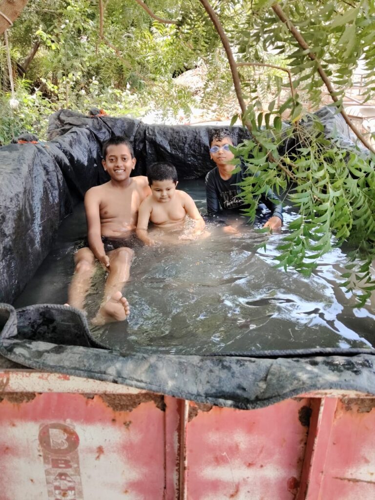 कोपरगाव बेट या ठिकाणी सागर परदेशी यांनी बनवले ट्रॉलीला स्विमिंग पूल पुतणी शिवांशी व मुलगा पृथ्वीराज यांचा हट्ट पुरवण्यासाठी सागर परदेशी यांनी ट्रॉली प्लास्टिक कागद टाकून मुलांसाठी छोटासा स्विमिंग पूल तयार केला ही आनंदाची गोष्ट आहे.