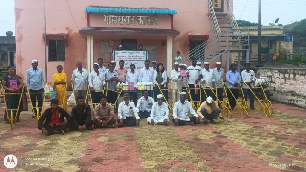 महात्मा फुले कृषि विद्यापीठाचे कुलगुरु डॉ. शरद गडाख, संशोधन संचालक डॉ. विठ्ठल शिर्के यांच्या मार्गदर्शनाखाली व कृषि अभियांत्रिकी विभाग प्रमुख तथा स्मार्ट इरिगेशन प्रकल्पाचे प्रमुख संशोधक डॉ. सुनील कदम यांच्या देखरेखीखाली नवी दिल्ली येथील भारतीय कृषि अनुसंधान परिषद व कृषि अभियांत्रिकी विभाग, महात्मा फुले कृषि विद्यापीठ राहुरी येथे कार्यरत असलेल्या कन्सोरशिया रिसर्च प्रोजेक्ट, आयओटी सक्षम व सेंसर आधारीत अद्ययावत सिंचन व्यवस्थापन प्रणाली प्रकल्पांतर्गत कृषि साहित्यवाटप कार्यक्रमाचे आयोजन मौजे कासारे, ता. पारनेर, जि. अहिल्यानगर येथे करण्यात आले होते. याप्रसंगी स्मार्ट इरिगेशन प्रकल्पाचे सहप्रमुख संशोधक डॉ. प्रमोद पोपळे, कासारे गावचे सरपंच श्री. शिवाजी निमसे, संशोधन सहयोगी डॉ. शुभांगी घाडगे, वरिष्ठ संशोधन सहकारी इंजि. शुभम सुपेकर आणि इंजि. गणेश उपस्थित होते. यावेळी स्मार्ट इरिगेशन प्रकल्पांतर्गत अनुसूचित जाती उपयोजनेच्या माध्यमातून कासारे गावातील 19 शेतकर्यांना कृषि साहित्याचे वाटप करण्यात आले. यामध्ये कृषि अवजारे, जैविक खते, जैविक औषधे व कृषिदर्शनी-2025 या साहित्याचा समावेश होता. याप्रसंगी डॉ. प्रमोद पोपळे यांनी प्रकल्पाविषयी सविस्तर माहिती देऊन शेतीसाठी उपयुक्त आधुनिक तंत्रज्ञानाची माहिती दिली. यावेळी त्यांनी भूगर्भातील पाणीसाठा वाढवण्यासाठी फायदेशीर ठरणार्या विविध पद्धतींची आणि मृदा व जलसंधारण याविषयी सविस्तर मार्गदर्शन केले. कार्यक्रमाचे सूत्रसंचालन व स्वागत श्री. शिवाजी निमसे यांनी केले.