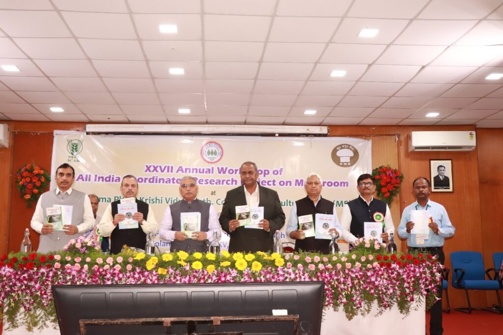 याप्रसंगी डॉ. विठ्ठल शिर्के आपल्या अध्यक्षीय मार्गदर्शनात म्हणाले की अळिंबी उत्पादनास लागणारी मर्यादित संसाधने व कमी गुंतवणूक यामुळे ग्रामीण तसेच अर्ध शहरी भागातील शेतकर्यांसाठी अळिंबी उत्पादन रोजगार निर्मिती व उत्पन्न वाढीसाठी उत्तम संधी आहे. अळिंबी उत्पादन तंत्रज्ञानाची सेंद्रिय शाश्वत शेती सोबत सांगड घालून प्रभावी व पर्यावरण पूरक नियंत्रण उपाययोजनांसाठी अधिकचे संशोधन होणे गरजेचे आहे. यावेळी डॉ. के. व्ही. प्रसाद यांनी आपल्या मार्गदर्शनात अळिंबीचे आपल्या आहारात प्रमाण वाढवणे गरजेचे असल्याचे नमूद केले. डॉ. वेदप्रकाश शर्मा यांनी भारतामध्ये कार्यरत विविध अळिंबी संशोधन प्रकल्पांच्या कार्याचा आढावा घेऊन प्रगती अहवाल सादर केला. याप्रसंगी उत्कृष्ट अळिंबी संशोधनकार्यासाठी इंदिरा गांधी कृषि विश्वविद्यालय रायपूर तसेच उत्कृष्ट विस्तार कार्याबद्दल डॉ. राजेंद्र प्रसाद केंद्रीय कृषि विश्वविद्यालय, समस्तीपुर या प्रकल्पांना सन्मानचिन्ह आणि प्रशस्तीपत्रक देऊन मान्यवरांच्या हस्ते गौरविण्यात आले. यावेळी अळिंबी संशोधन उत्पादन तंत्रज्ञान व प्रशिक्षण या विषयावरील विविध प्रकाशनांचे विमोचन मान्यवरांच्या हस्ते करण्यात आले. कार्यक्रमाचे प्रास्ताविक डॉ. महानंद माने यांनी केले. कार्यक्रमाचे सूत्रसंचालन डॉ. पल्लवी सूर्यवंशी यांनी तर आभार डॉ. राजेंद्र खडतरे यांनी मानले. या कार्यक्रमासाठी विविध अळिंबी संशोधन प्रकल्पांचे शास्त्रज्ञ, विद्यार्थी आणि कर्मचारी मोठ्या संख्येने उपस्थित होते.