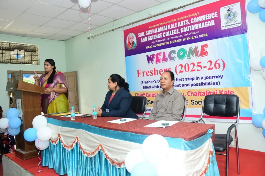 कर्मवीर शंकरराव काळे एज्युकेशन सोसायटीच्या सौ.सुशीलामाई काळे कला, वाणिज्य व विज्ञान महाविद्यालयात २०२५-२६ या शैक्षणिक वर्षामध्ये सावित्रीबाई फुले पुणे विद्यापीठ व महाराष्ट्र शासन यांच्या मान्यतेने एम. ए. (इतिहास), एम. कॉम. व एम. एस.सी. (केमिस्ट्री व बॉटनी) हे अभ्यासक्रम सुरू करण्यात आले आहे. या अभ्यासक्रमांना प्रवेश घेतलेले विद्यार्थी-विद्यार्थिनी तसेच प्रथम वर्षातील कला,वाणिज्य व विज्ञान या शाखेचे विद्यार्थी-विद्यार्थिनींचा स्वागत समारंभ कर्मवीर शंकरराव काळे एज्युकेशन सोसायटीच्या सचिव सौ.चैतालीताई काळे व संस्थेचे इन्स्पेक्टर प्रा.नारायण बारे यांच्या प्रमुख उपस्थितीत संपन्न झाला.यावेळी विद्यार्थी-विद्यार्थिनींना मार्गदर्शन करतांना त्या बोलत होत्या.