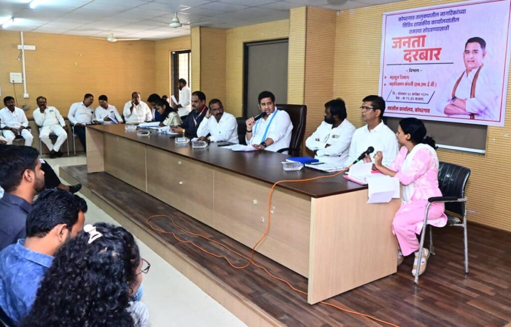 कोपरगाव मतदार संघातील नागरिकांच्या महसूल विभाग व महावितरण कंपनी ह्या विभागांतील समस्या सोडवण्यासाठी आ. आशुतोष काळे यांच्या अध्यक्षतेखाली सोमवार (दि.०८) रोजी तहसील कार्यालय कोपरगाव येथे ‘जनता दरबार’ पार पडला.यावेळी या जनता दरबारामध्ये महावितरण संदर्भात कमी क्षमतेने होणारा वीज पुरवठा, लोंबकळत असलेल्या वीज वाहिन्या, खंडित वीजपुरवठा, नवीन वीज रोहित्र मागणी, नवीन स्मार्ट वीज मीटर बसविणे, वीज बीलातील त्रुटी तसेच महसूल विभागाच्या बाबत महसूल नोंदी, शिवार रस्ते, उत्पन्न प्रमाणपत्रे, ७/१२ उतारे, पोट खराबा, रेशन, अशा अनेक बाबतीत नागरीकांनी आपल्या व्यथा आ.आशुतोष काळे यांच्यापुढे मांडल्या.त्यावेळी प्रत्येक व्यक्तीच्या अडचणी समजावून घेत आ.आशुतोष काळे यांनी संबंधित अधिकाऱ्यांना नागरीकांचे प्रश्न सोडविण्याचे निर्देश दिले.