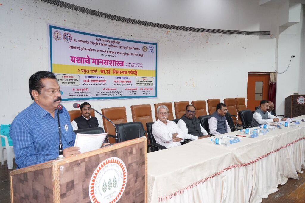 महात्मा फुले कृषी विद्यापीठ, राहुरी येथील डॉ. अण्णासाहेब शिंदे कृषी अभियांत्रिकी व तंत्रज्ञान महाविद्यालय, राहुरी येथील रोटरी क्लब व सावित्रीबाई फुले माध्यमिक व उच्च माध्यमिक विद्यालय यांच्या संयुक्त विद्यमाने यशाचे मानसशास्त्र या विषयावर कार्यक्रमाचे आयोजन करण्यात आले होते. या कार्यक्रमाच्या अध्यक्षस्थानावरुन डॉ. साताप्पा खरबडे बोलत होते. यावेळी प्रमुख पाहुणे म्हणून नाशिक येथील प्रसिद्ध मानसशास्त्रज्ञ व माजी सहाय्यक पोलीस आयुक्त डॉ. सिताराम कोल्हे उपस्थित होते. याप्रसंगी कृषी अभियांत्रिकी महाविद्यालयाचे सहयोगी अधिष्ठाता डॉ. सचिन नलावडे, अन्नशास्त्र व तंत्रज्ञान विभाग प्रमुख डॉ. विक्रम कड, राहुरी रोटरी क्लबचे सचिव डॉ. जयंत कुलकर्णी, रोटरी क्लबचे अध्यक्ष इंजि. अविनाश साबरे, सावित्रीबाई फुले माध्यमिक विद्यालयाचे मुख्याध्यापक श्री. अरुण तुपविहीरे व सावित्रीबाई फुले प्राथमिक विद्यालयाचे मुख्याध्यापक श्री. बाळासाहेब खेत्री उपस्थित होते.