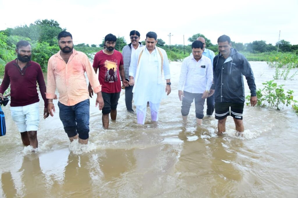 कोळपेवाडी वार्ताहर :- कोपरगाव मतदार संघात शनिवार (दि.२७) रोजी सायंकाळी सहा वाजेपासून सुरु झालेल्या पावसाने सलग अठरा तास हजेरी लावत रौद्र रूप धारण करून शेतीचे अतोनात नुकसान केले.काढणीला आलेल्या सोयाबीन,बाजरी,कापूस,मका,तूर, भाजीपाला, फळ पिकांचे व चारा पिकांचे मोठ्या प्रमाणात नुकसान झाले. तर काही ठिकाणी नागरीकांच्या घरात पाणी शिरल्यामुळे संसारोपयोगी साहित्याचे नुकसान झाले. काही ठिकाणी घरांच्या भिंती कोसळून घरांचे नुकसान झाले. झालेल्या नुकसानीची पाहणी करण्यासाठी आ.आशुतोष काळे यांनी रविवार (दि.२८) रोजी सकाळपासून मतदार संघातील नुकसानग्रस्त भागाला बेट दिली. भर पावसात शेतकऱ्यांच्या बांधावर जावून झालेल्या नुकसानीची पाहणी करून मी आणि महायुती शासन तुमच्या पाठीशी आहे काळजी करू नका अशा शब्दात धीर दिला. काही ठिकाणी पुराच्या पाण्यात अडकलेल्या नागरिकांना सुरक्षित स्थळी हलविण्यासाठी प्रशासनाला सूचना देवून नागरिकांच्या राहण्याची,भोजनाची व्यवस्था करून मदतीसाठी स्वत:ची यंत्रणा उभी करून मदत केली.