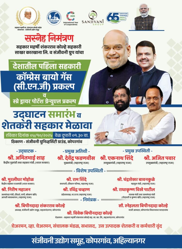 संजीवनी उद्योग समुहाच्या देशातील पहिल्या सहकारी सी. एन.जी प्रकल्पाचे उद्घाटन आणी शेतकरी मेळावा मोठ्या उत्साहात संपन्न होणार आहे तरीही नागरिकांनी मोठ्या संख्येने उपस्थित रहावे असे निमंत्रण संजीवनी उद्योग समूहाच्या वतीने देण्यात आले आहे..