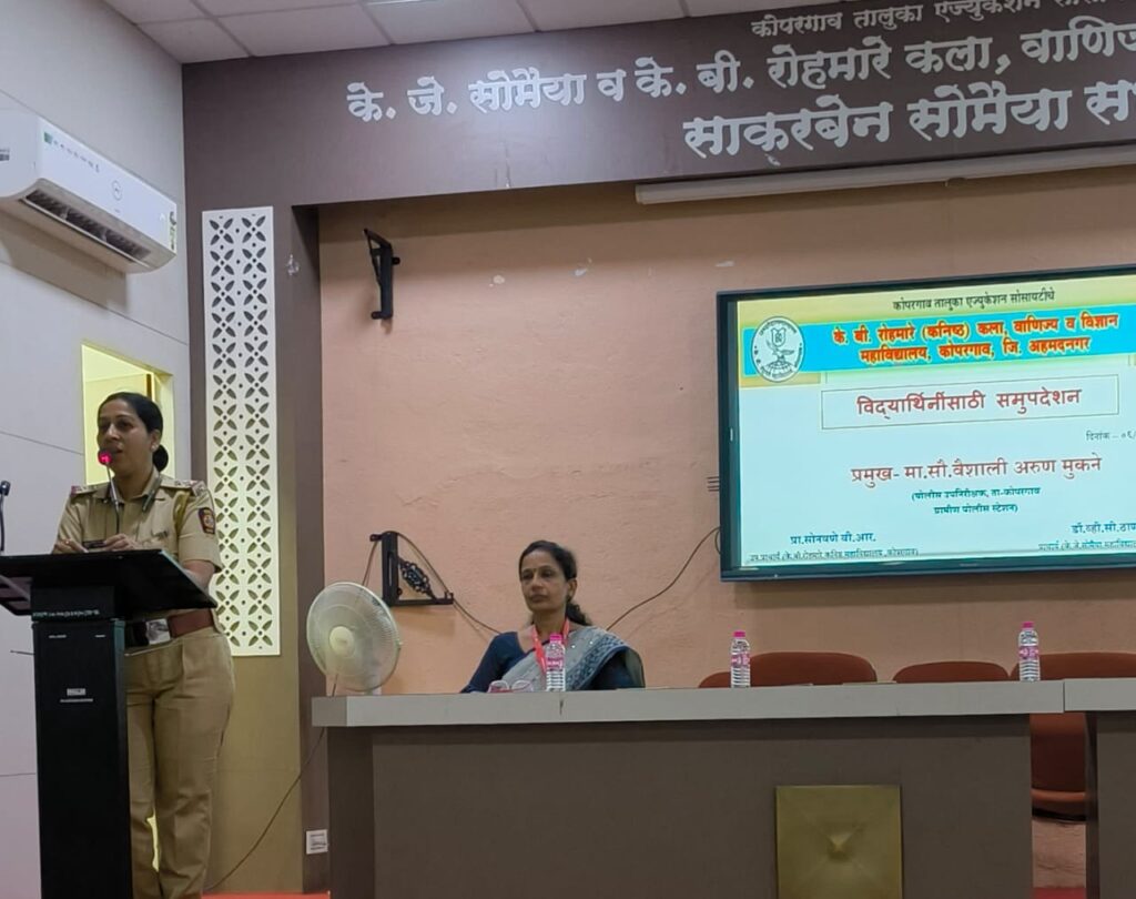 कोपरगाव प्रतिनिधी : के. बी. रोहमारे कनिष्ठ महाविद्यालय, कोपरगाव येथे नुकतीच विद्यार्थिनींसाठी सक्षमीकरण, कायदेविषयक जाणीव जागृती कार्यशाळा व समुपदेशन सत्र संपन्न झाले. यावेळी विद्यार्थिनींना मार्गदर्शन करण्यासाठी कोपरगाव पोलीस ग्रामीण पोलीस स्टेशनच्या पोलीस उपनिरीक्षक वैशाली मुकणे या उपस्थित होत्या. यावेळी महाविद्यालयातील सर्व विद्यार्थिनींसोबत शिक्षिकाही उपस्थित होत्या.