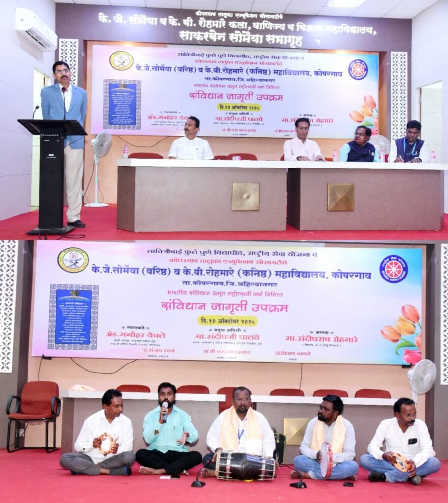 कोपरगाव प्रतिनिधी:-कोपरगांव तालुका एज्युकेशन सोसायटी संचलित के.जे. सोमैया (वरिष्ठ) व के.बी.रोहमारे (कनिष्ठ) महाविद्यालय कोपरगाव येथे सावित्रीबाई फुले पुणे विद्यापीठ, राष्ट्रीय सेवा योजना विभागाच्या संयुक्त विद्यमाने भारतीय संविधान अमृत महोत्सव वर्षानिमित्त भारतीय संविधान जागृती उपक्रमाचे आयोजन करण्यात आले होते. या उपक्रमात संविधान जागृती पथनाट्य, रांगोळी, संविधान जागृती व्याख्यान व संविधानाचे महत्त्व नमूद करणारे गीत इत्यादी उपक्रमांचे आयोजन करण्यात आले होते. कार्यक्रमाची सुरुवात राष्ट्रीय सेवा योजना विभागाच्या स्वयंसेवकांनी बनविलेल्या संविधान विषयक पथनाट्याच्या सादरीकरणाने झाली. या पथनाट्यातुन स्वयंसेवकांनी संविधानाचे विविध कलमे व अधिकार समजुन सांगितले. या कार्यक्रमासाठी प्रमुख व्याख्याते म्हणून कोपरगाव वकील संघाचे माजी अध्यक्ष मा.ॲड. मनोहर येवले उपस्थित होते. त्यांनी आपल्या मार्गदर्शनात भारतीय संविधान निर्मितीचा इतिहास, महत्व व संविधानाने प्राप्त झालेले अधिकार व कर्तव्ये यांची माहिती उपस्थितांना देतानांच संविधान हा लोकशाहीचा व जनतेच्या न्याय हक्काचा पाया असल्याचे म्हटले. कार्यक्रमाच्या दुसर्या सत्रात मा. अरुण त्रिभुवन, मा. संजय दुशिंग, मा.नितीन शिंदे, मा.वैभव पगारे व मा.प्रदीप अहिरे यांनी संविधान जागृती विषयक विविध गीते सादर झाली. कार्यक्रमाच्या स्वागत मनोगतात महाविद्यालयाचे प्राचार्य डॉ.विजय ठाणगे यांनी सावित्रीबाई फुले पुणे विद्यापीठ, राष्ट्रीय सेवा योजना विभागाने भारतीय संविधान अमृत महोत्सवी वर्षानिमित्त महाविद्यालयाला संविधान जागृती उपक्रम आयोजनाची संधी उपलब्ध करून दिल्याबद्दल धन्यवाद व्यक्त करतांना या उपक्रमाच्या माध्यमातून विद्यार्थ्यांना संविधानिक अधिकाराबरोबरच सामाजिक कर्तव्याची माहीती मिळण्यास मदत होईल असे म्हटले. यावेळी त्यांनी उपस्थितांना संविधानिक मूल्ये जीवनात अंगीकारण्याचे आवाहन केले. कार्यक्रमाच्या अध्यक्षस्थानी संस्थेचे विश्वस्त मा. संदीपराव रोहमारे हे होते. कार्यक्रमाचे प्रास्ताविक व पाहुण्यांचा परिचय राष्ट्रीय सेवा योजनेचे कार्यक्रम अधिकारी डॉ. बी. एस. गायकवाड़ यांनी केला. सूत्रसंचालन व आभार प्रदर्शन कार्यक्रम अधिकारी डॉ.संजय दवंगे यांनी केले. या उपक्रमासाठी डॉ. जिभाऊ मोरे, डॉ. रविंद्र जाधव, प्रा.रोहिणी घुगे, प्रा. किरण सोळसे हे प्राध्यापक व राष्ट्रीय सेवा योजना विभागाचे बहुसंख्य विद्यार्थी उपस्थित होते.