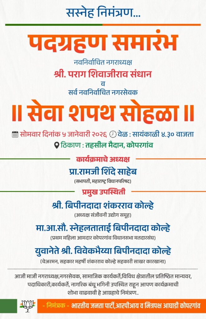 कोपरगाव शहराच्या राजकीय व सामाजिक इतिहासात एक महत्त्वाचा क्षण म्हणून सोमवारी दि. ५ जानेवारी २०२६ रोजी नवनिर्वाचित नगराध्यक्ष व नगरसेवकांचा पदग्रहण व सेवा शपथ सोहळा मोठ्या उत्साहात पार पडणार आहे. तहसील मैदान, कोपरगाव येथे सायंकाळी ४.३० वाजता या भव्य कार्यक्रमाचे आयोजन करण्यात आले आहे.