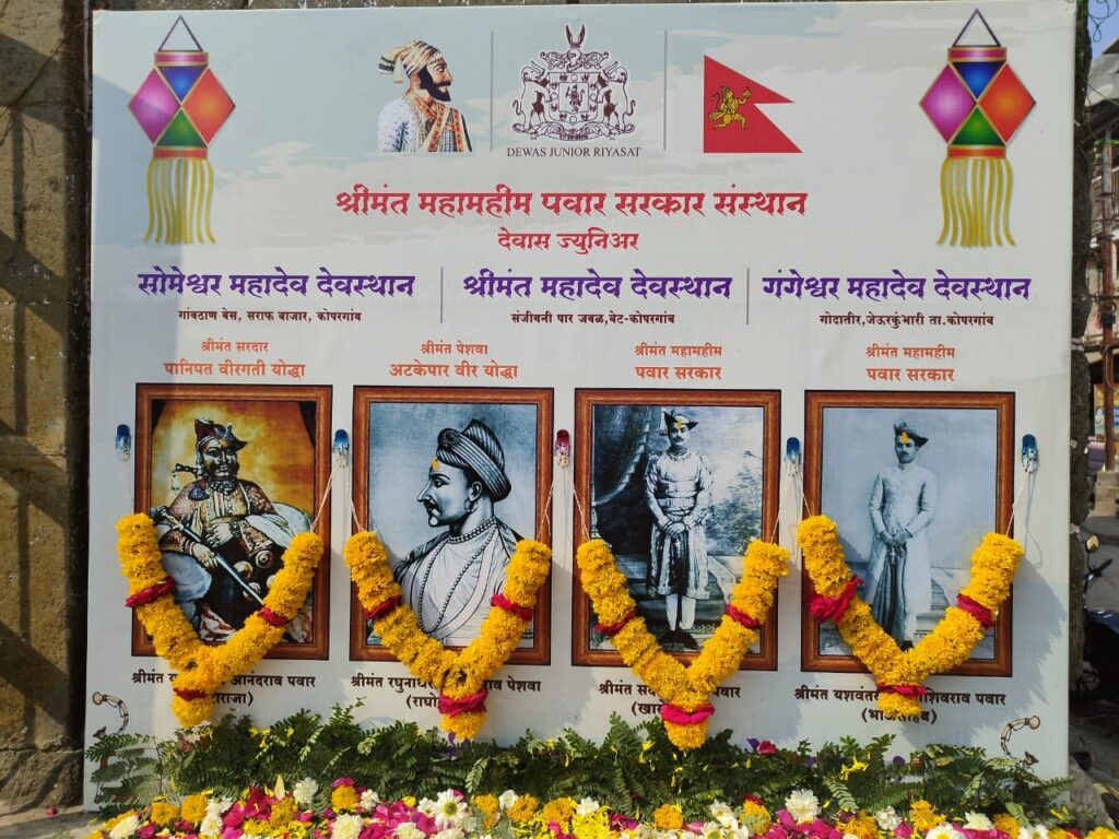 पानिपतच्या रणभूमीवरील रणझुंजार वीर योद्धा श्रीमंत सरदार यशवंतराव आनंदराव पवार, मराठा साम्राज्याची पताका अटकेपार नेणारे श्रीमंत रघुनाथराव (राघोबादादा) बाजीराव पेशवा, कोपरगाव नगरीचा कारभार पहाणारे श्रीमंत महामहीम सदाशिवराव (खासेसाहेब) श्रीमंत महामहीम यशवंतराव (भाऊसाहेब) सदाशिवराव पवार यांच्या प्रतिमेचे पूजन कोपरगांवचे वीज वितरण अभियंता धनंजय धांडे, मा. कॅप्टन सागर बडदे, श्रीमंत पवार सरकार संस्थानचे सोमेश्वर महादेव देवस्थान प्रमुख महेंद्र पाटील ,मुख्य कार्यकारी अधिकारी सुशांत घोडके यांचे शुभहस्ते करण्यात आले. "हर हर महादेव, छत्रपती शिवाजी महाराज की जय श्रीमंत महामहीम पवार सरकार की जय" असा जय घोष करीत २१ तोफांची सलामी देण्यात आली.