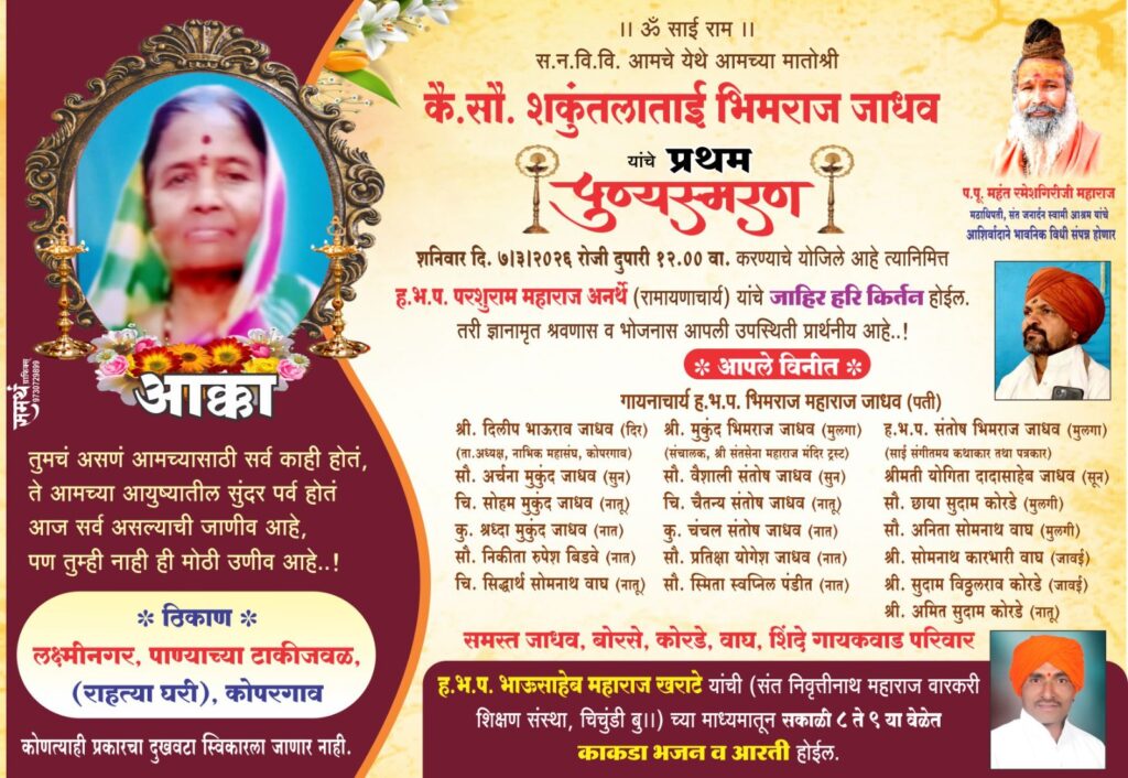 दि.७ मार्च २०२६ वार. शनिवार रोजी स्व.सौ. शकुंतला भिमराज जाधव यांचे प्रथम पुण्यस्मरण दिनानिमित्त काकडा भजन कीर्तन प्रवचनाचा कार्यक्रम ठेवला आहे.हेच आमंत्रण समजुन यावे. Uncategorized March 5, 2026March 5, 2026Santosh JadhavLeave a Comment on दि.७ मार्च २०२६ वार. शनिवार रोजी स्व.सौ. शकुंतला भिमराज जाधव यांचे प्रथम पुण्यस्मरण दिनानिमित्त काकडा भजन कीर्तन प्रवचनाचा कार्यक्रम ठेवला आहे.हेच आमंत्रण समजुन यावे. आपलाच:- संतोष भिमराज जाधव परिवार * Post Views: 25