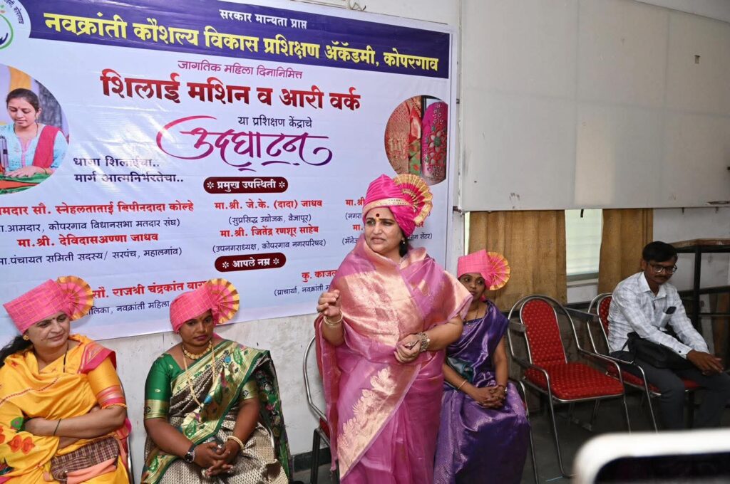 सरकार मान्यता प्राप्त नवक्रांती कौशल्य विकास प्रशिक्षण अकॅडमी, कोपरगाव तसेच जागतिक महिला दिनाचे आयोजन करण्यात आले होते. शिलाई मशीन व आरी वर्क या प्रशिक्षण केंद्राचे उद्घाटन व सर्टिफिकेट वितरण कोपरगाव विधानसभा मतदारसंघाच्या प्रथम महिला मा. आ. स्नेहलताताई कोल्हे यांच्या उपस्थितीत पार पडले. यावेळी त्या महिलांना मार्गदर्शन करताना व्यासपीठावर बोलत होत्या. यावेळी मतदारसंघातील विविध कर्तुत्ववान महिलांचा त्यांच्या हस्ते सत्कार करण्यात आला. यावेळी कार्यक्रमास सहकार महर्षी कोल्हे कारखाना संचालक रमेश घोडेराव, नवक्रांती संस्थेचे संस्थापक चंद्रकांत बागुल,राजश्री बागुल आदींसह महिला भगिनी व विविध प्रतिष्ठित मान्यवर उपस्थित होते.