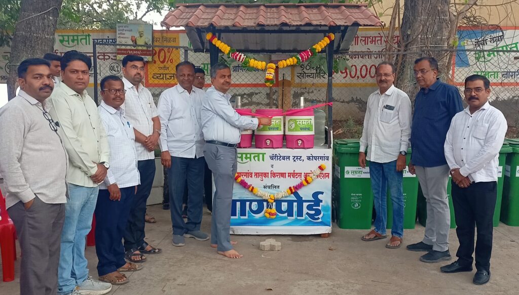 कोपरगाव प्रतिनिधी :-समता चॅरिटेबल ट्रस्ट आणि कोपरगाव तालुका किराणा मर्चंट असोसिएशन यांच्या संयुक्त विद्यमाने गत वर्षीप्रमाणे या ही वर्षी कोपरगाव आगारात पाणपोईचे उद्घाटन कोपरगाव तालुका किराणा मर्चंट असोसिएशनचे अध्यक्ष राजकुमार बंब यांच्या शुभहस्ते करण्यात आले. या पाणपोईमुळे प्रवाशांना जाग्यावरच स्वच्छ पिण्याचे पाणी उपलब्ध होणार असून उन्हाळ्याच्या पार्श्वभूमीवर हा उपक्रम अत्यंत उपयुक्त ठरणार आहे.
